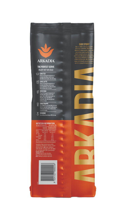 Arkadia Chai Tea Spice Latte is Australia’s favourite Chai Tea, with more cups of Arkadia Chai Latte consumed in Australia every day than any other brand. It is as versatile as it is delicious, suitable for Chai Tea, Chai Latte, Iced Chai and Chai Frappes.